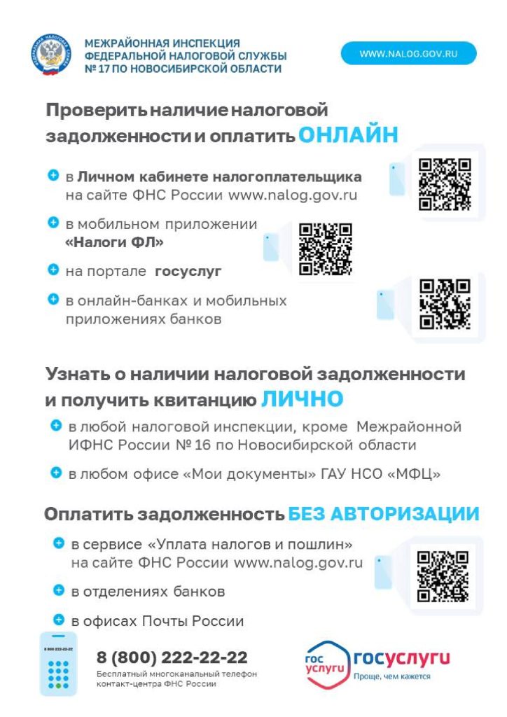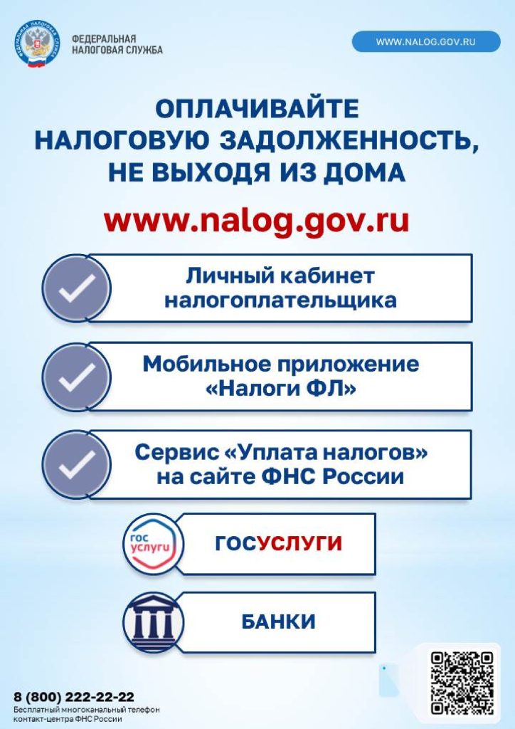 Оплатить задолженность можно в отделениях банков и офисах Почты России, а также онлайн без авторизации через сервис «Уплата налогов и пошлин» на сайте ФНС России https://clck.ru/ZFreV.