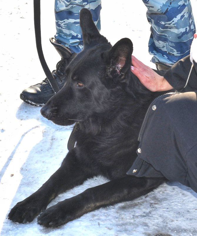 Пёс Зевс быстро справился с поставленной задачей и специальной стойкой указал место закладки. Дети задали много вопросов о службе собаки, ее характере и даже о том, когда Зевс уйдет на пенсию.