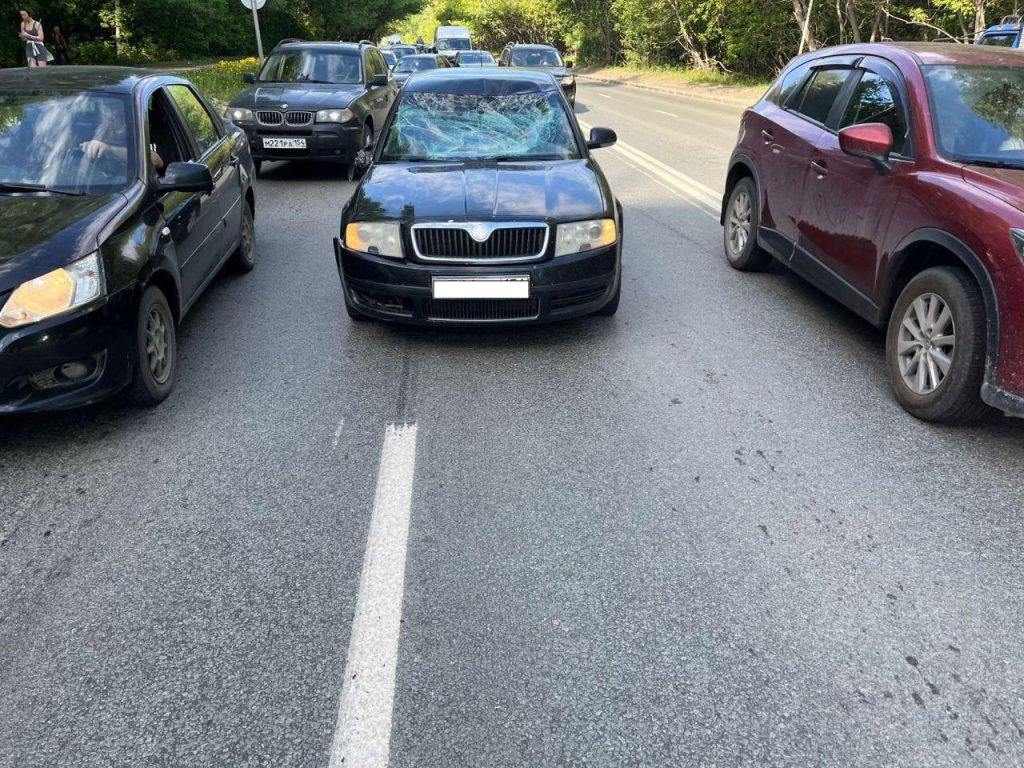 В районе здания №102 на улице Выборной произошло ДТП с участием дикого животного. Лось пересекал проезжую часть, водитель не успел вовремя среагировать. Автомобиль получил значительные повреждения. Животное было травмировано, но смогло отползти на обочину.